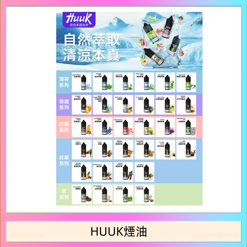 茶系列-鐵觀音, 茶系列-白桃烏龍, 茶系列-宇治抹茶, 茶系列-茉莉花茶, 水果系列-藍莓爆珠, 水果系列-葡萄漿果, 水果系列-熱情代基裹, 水果系列-百香果汁, 水果系列-蘋果蜜桃, 水果系列-冰鎮西瓜, 薄荷系列-原味薄荷, 薄荷系列-薄荷甘露, 薄荷系列-絕對零度, 薄荷系列-深度凍結, 薄荷系列-奶香薄荷, 薄荷系列-薄荷口香糖, 惡魔系列-白魔爪, 惡魔系列-藍魔爪, 惡魔系列-原味魔爪, 惡魔系列-太平洋魔爪, 惡魔系列-壞蘋果魔爪, 惡魔系列-小熊軟糖魔爪, 煙草系列-雪茄, 煙草系列-翠貝卡, 煙草系列-摩托車, 煙草系列-堅果煙草, 煙草系列-黑星煙草, 煙草系列-經典烤菸, 煙草系列-黃油煙草, 煙草系列-旅程煙草, 煙草系列-原味菸草, 煙草系列-VCT原味黑金